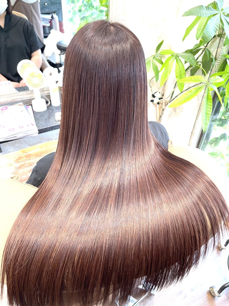 今話題の酸熱トリートメント配合のメニューで、酸熱トリートメントの欠点のカラーが同時に出来ない。かたくなる。異臭があるなど、欠点を回避。