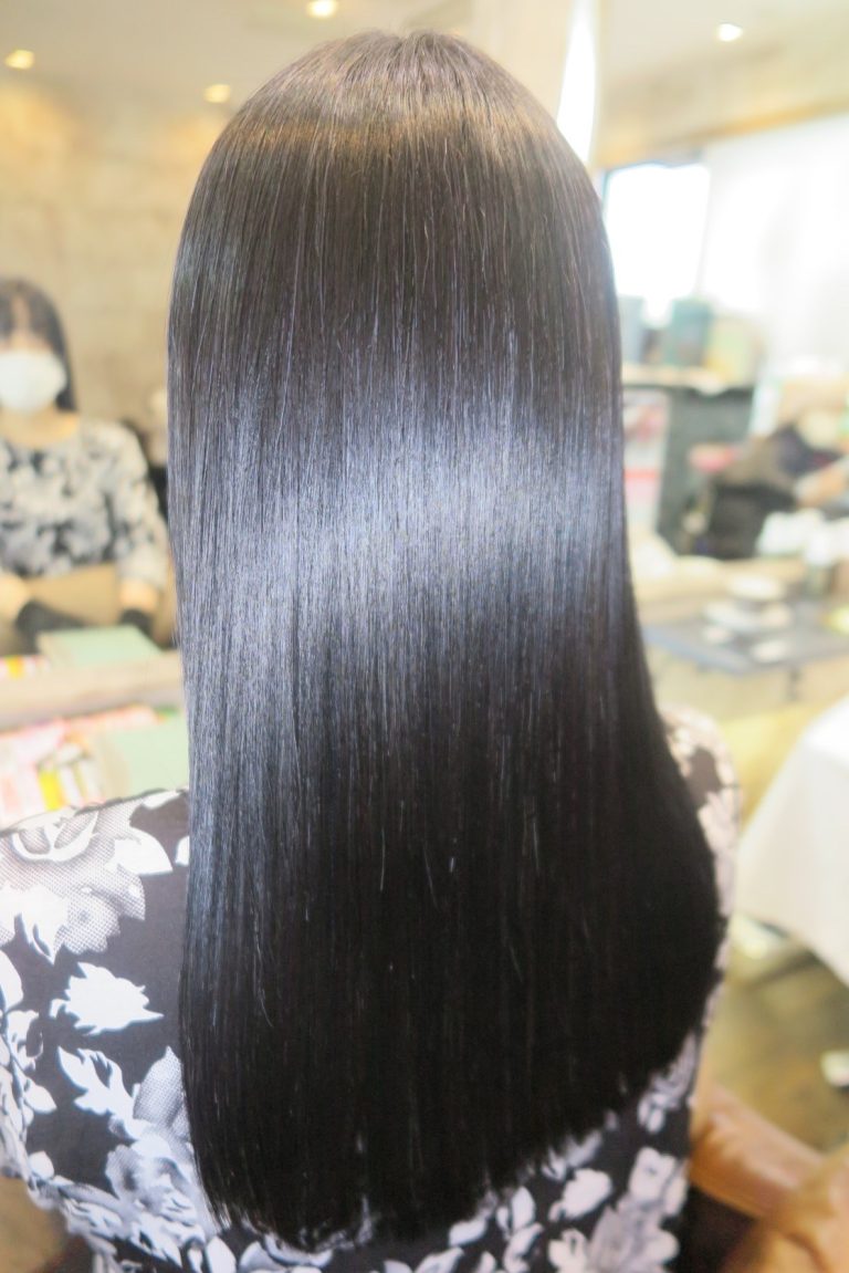 定期的に縮毛矯正をかけていますが、ホームケアでシャンプーやスーパーパックを使っていただいてるので毛先までツヤツヤですね!!
