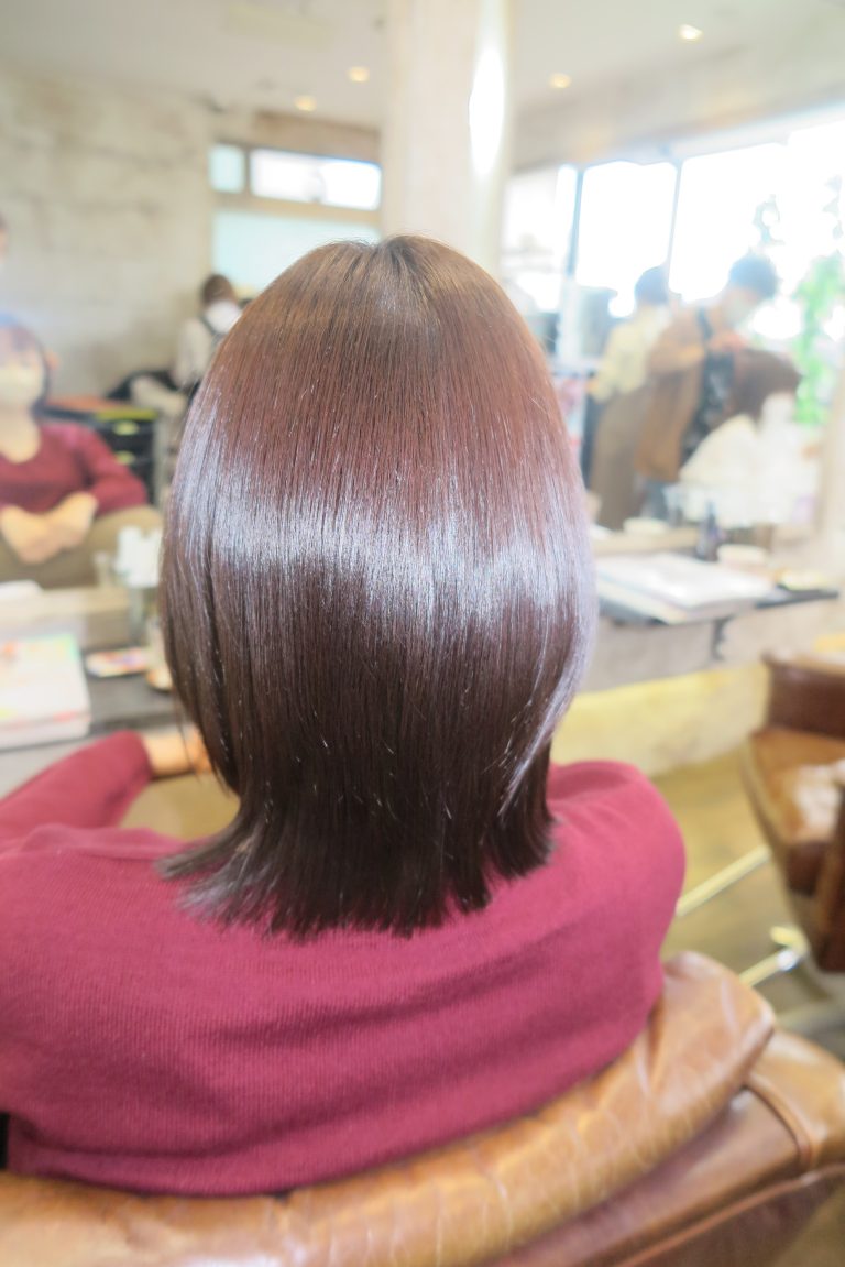 柔らかめの細い髪で痛みやすい髪質ですが、施術途中にトリートメントを一緒に入れていくことでダメージを教えながら自然な丸みの残るストレートになりました!